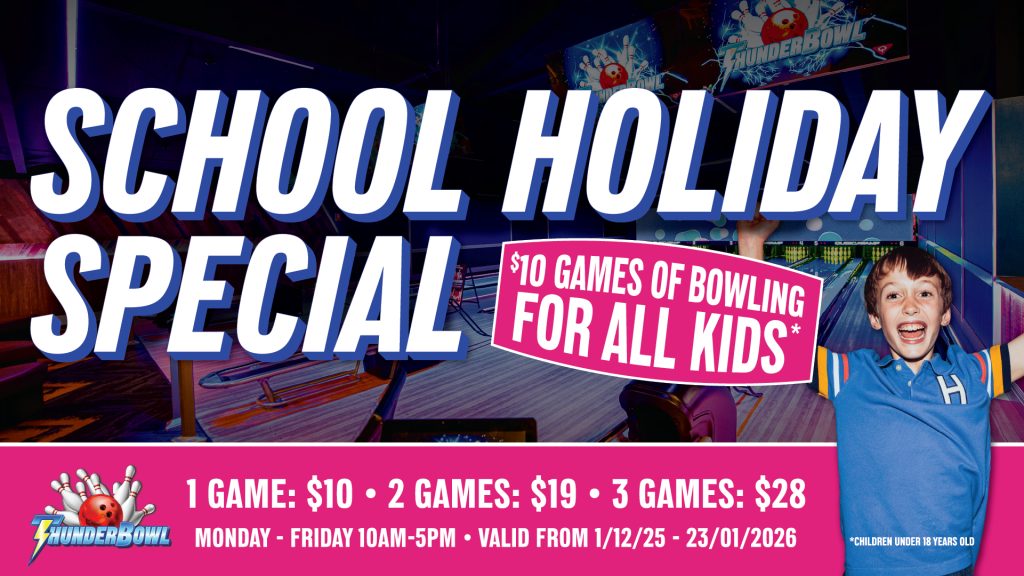ThunderBowl has everything you need to keep the kids busy these school holidays. We will have $10 GAMES OF BOWLING for all kids under 18 years old. Available from Mon – Fri 10am – 5pm from December 1st – January 23rd. Book your lane now!